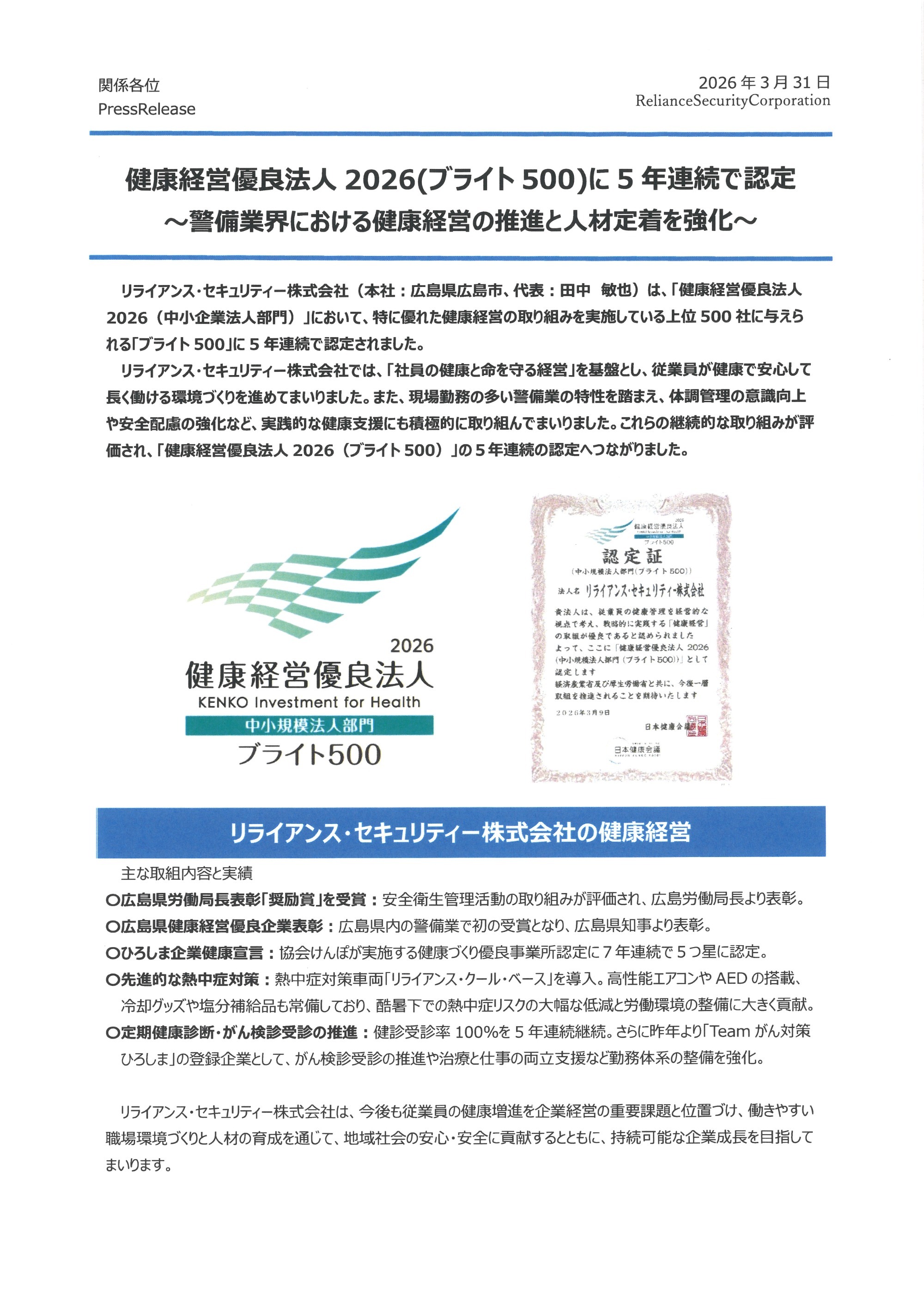 「健康経営優良法人2026(中小企業法人部門)」において、特に優れた健康経営の取り組みを実施している上位500社に与えられる「ブライト500」に5年連続で認定されました。